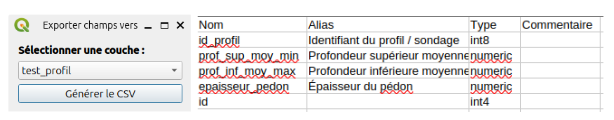 Ici, il s’agit par exemple d’exporter, dans un fichier .csv, certaines propriétés de champs d’une couche sélectionnée au préalable dans le projet QGIS.