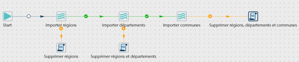 Avec ce fonctionnement, en cas d’erreur sur le dernier « pipeline » d’une séquence de « pipeline » réalisant chacun des insertions en table, toutes les insertions réalisées en amont sans erreurs par les deux autres « pipeline » seront bien effectives. Si l’erreur sur le 3ème pipeline n’est pas captée et gérée (par exemple, pour purger les tables peuplées en amont) cela conduit à une incohérence du jeux de données importé.