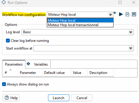 Selon vos besoins, il peut être nécessaire d’ajouter des configurations différentes et de choisir celle qui sera utilisée pour exécuter le processus directement via hop-gui ou hop-run :